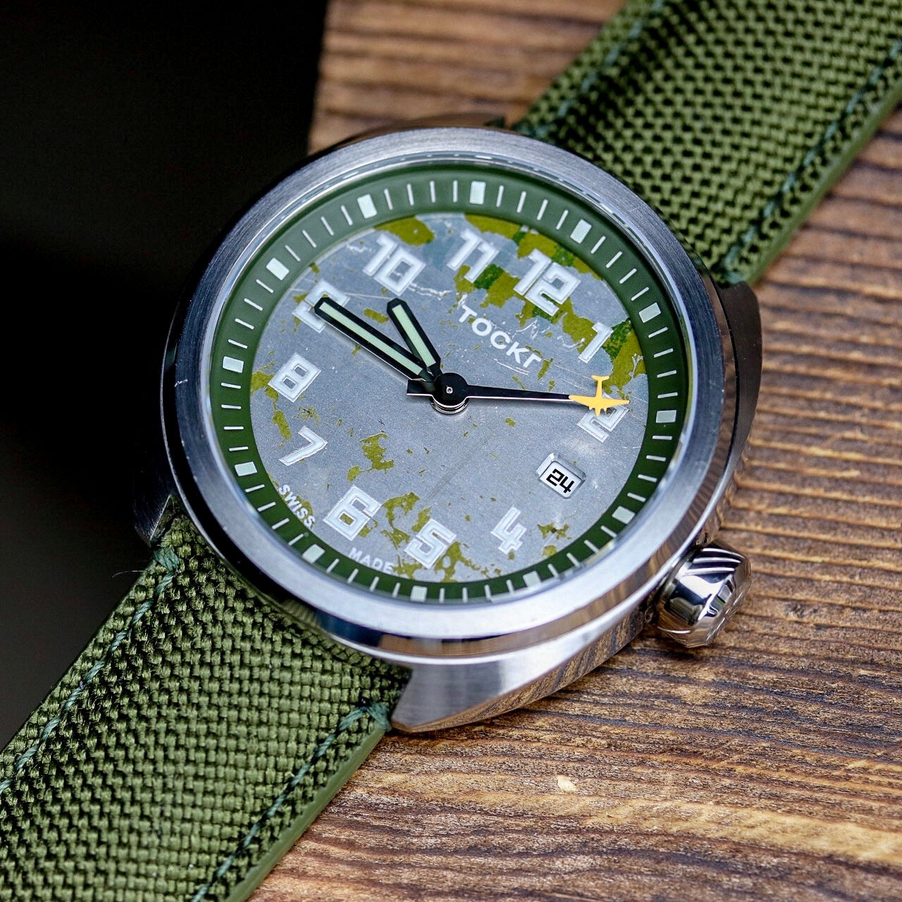 Texas-based independent brand Tockr makes watches with dials made out of aluminum, such as the Tockr D-Day C-47. But it’s not just any aluminum. It’s metal salvaged from a WW2 paratrooper transport plane, and the patina is readily evident. The unique way the metal has aged is now preserved under sapphire crystal, and each dial is unique — some featuring extensive wear and others with traces of actual stamped lettering.
